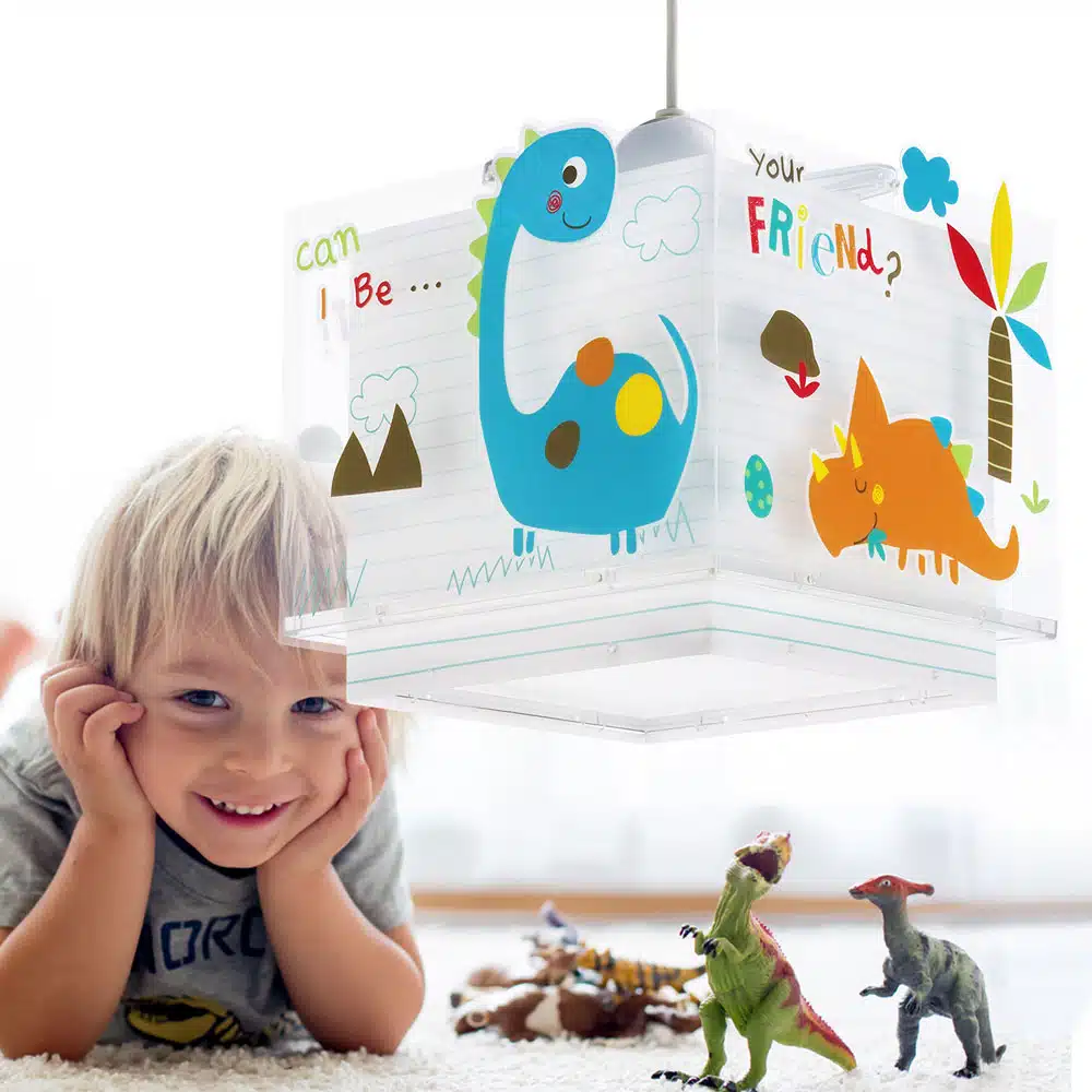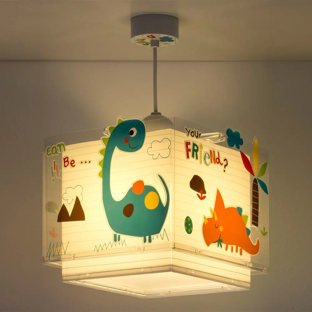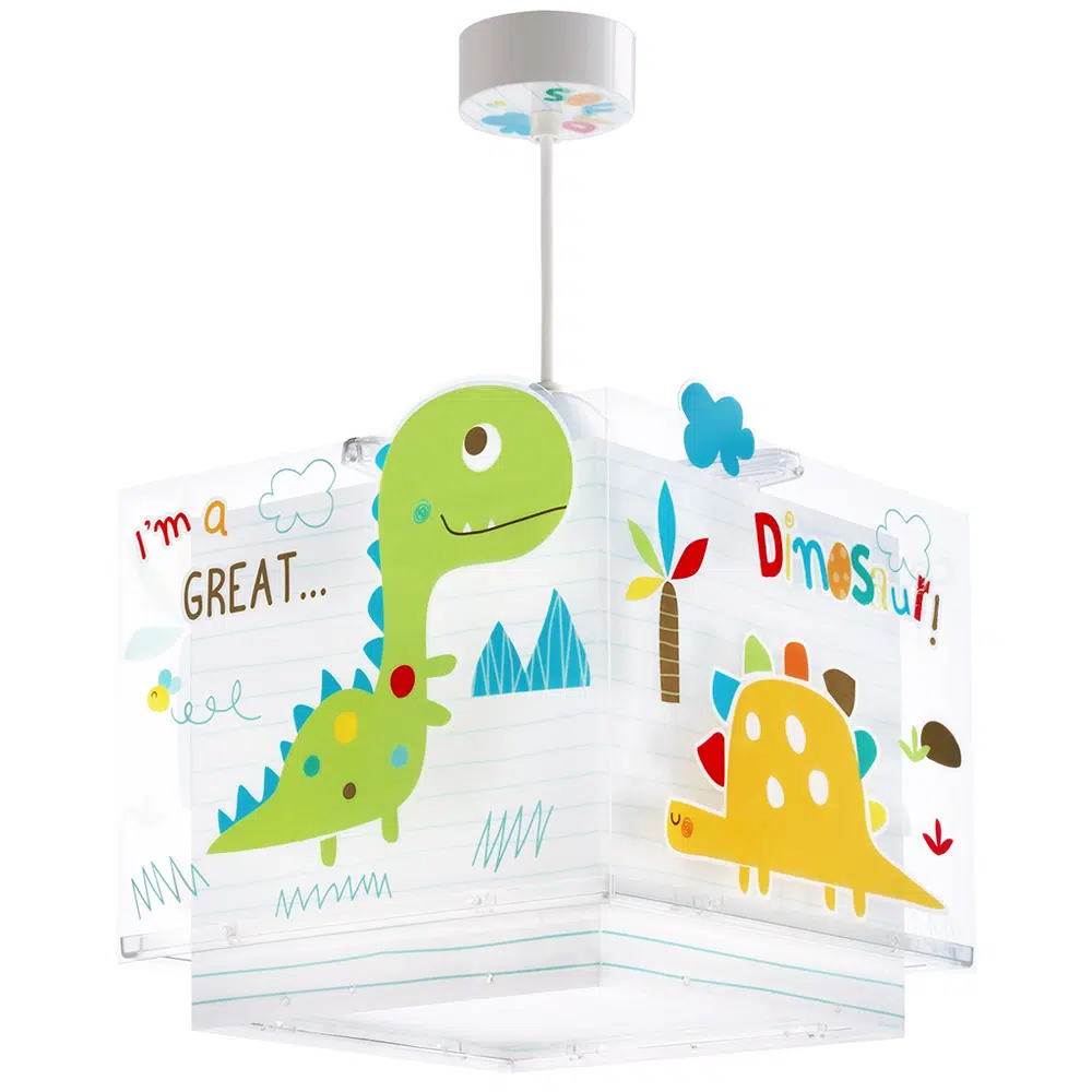 Καλωσορίστε το παιδί σας σε ένα δωμάτιο πλημμυρισμένο από μαγεία με αυτό το παιδικό φωτιστικό οροφής με θέμα τα δεινοσαυράκια κατάλληλο για γενικό φωτισμό. Είναι διπλού τοιχώματος με διάφανο το εξωτερικό του και μαγικά φωσφορίζοντα μέρη στο σκοτάδι. Το Dinos κρεμαστό παιδικό φωτιστικό οροφής είναι κατασκευασμένο από συνθετικό υλικό αντοχής πολυπροπυλενίου και ανεξίτηλες εκτυπώσεις. Παρέχεται διαχυτής φωτός που προστατεύει τα μάτια των παιδιών μικρότερων ηλικιών αλλά και προσφέρει ομοιόμορφο φωτισμό σε κάθε παιδικό δωμάτιο. Το κιτ ανάρτησης είναι πλήρες και περιέχει σετ γάντζου, καλώδιο ρυθμιζόμενο στο ύψος καθώς και ροζέτα κάλυψης σημείων σύνδεσης & στήριξης.  Το Dinos κρεμαστό παιδικό φωτιστικό οροφής συμπληρώνει τα υπόλοιπα φωτιστικά της συλλογής, τοποθετείται εύκολα και είναι κατασκευασμένο εξ ολοκλήρου στην Ευρώπη.
