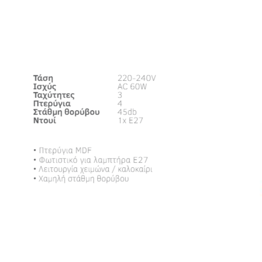Ανεμιστήρας οροφής της εταιρείας Lineme, με ισχύ 60 Watt. Η διάμετρος του είναι 132 εκατοστά και μπορεί να καλύψει χώρους από 15 m² έως 20 m².