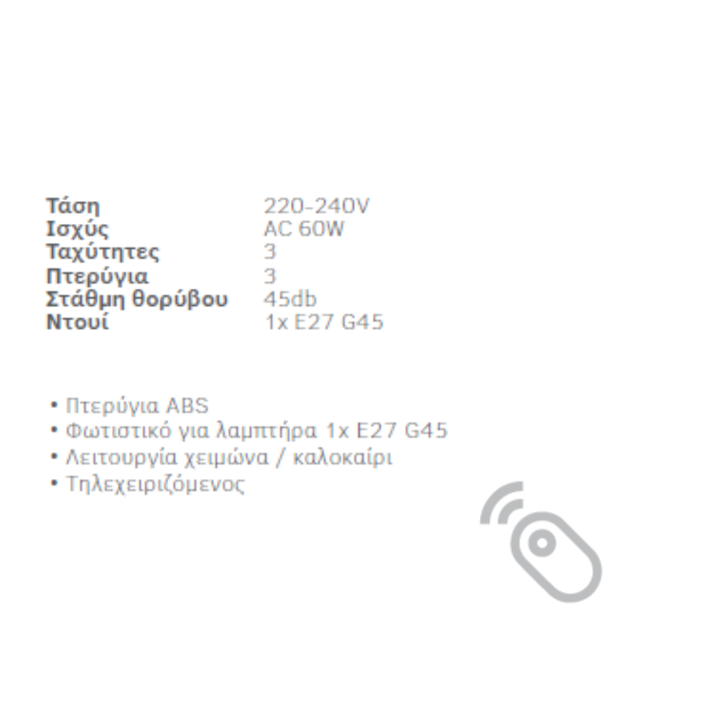 Συνήθως τοποθετείται στη θέση κάποιου φωτιστικού, και για αυτόν τον λόγο είναι εξοπλισμένος με δικό του φωτιστικό για αντικατάσταση του προηγούμενου. Με το τηλεχειριστήριο που διαθέτει θα είστε σε θέση να ρυθμίζετε άνετα από απόσταση οποιαδήποτε παράμετρο του ανεμιστήρα επιθυμείτε.