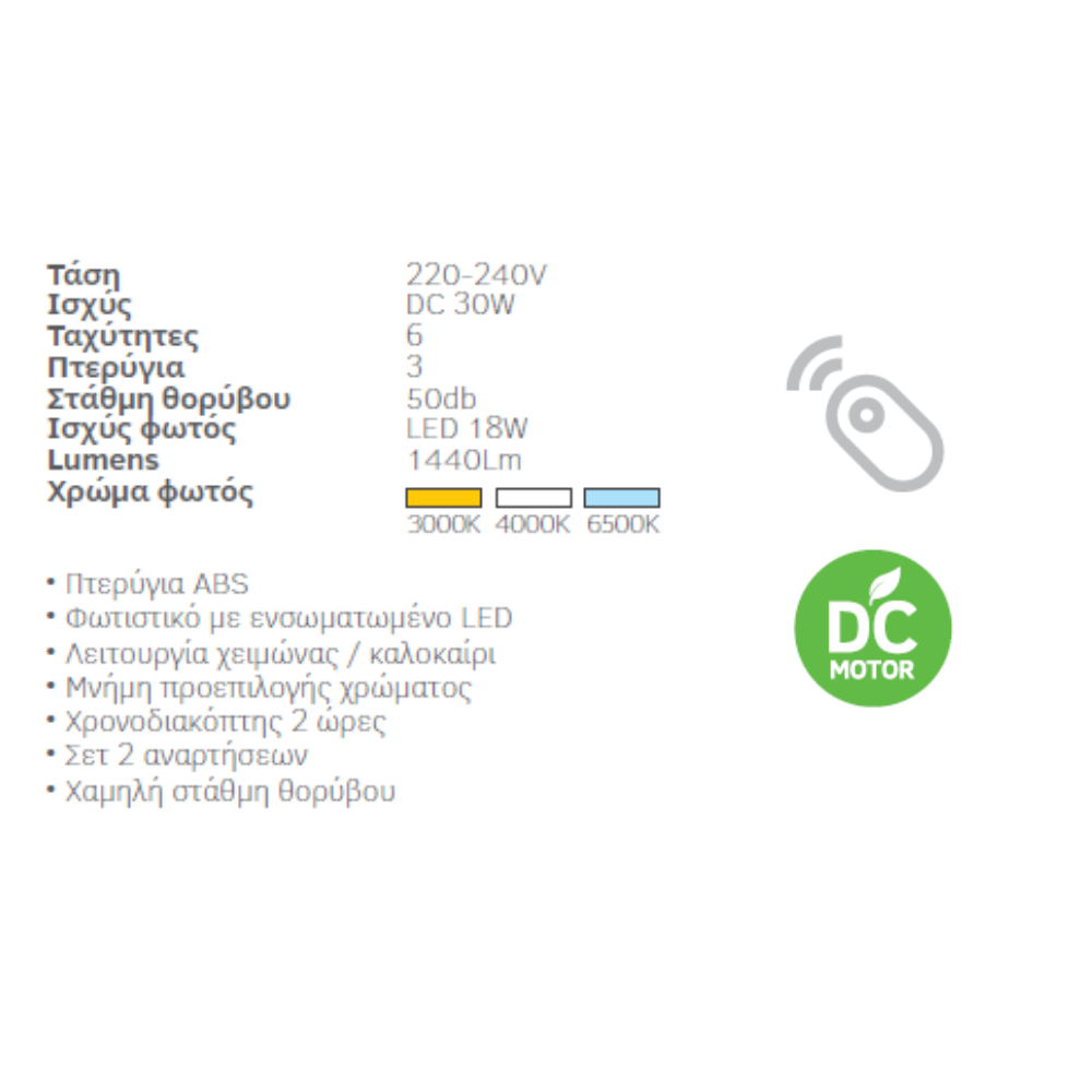 ΑΝΕΜΙΣΤΗΡΑΣ ΟΡΟΦΗΣ+ΤΗΛΕΧΕΙΡΙΣΤΗΡΙΟ IP55 52″ led 18W RHEA ΧΡΩΜΑ ΦΩΤΟΣ 3000Κ/4000Κ/6500Κ,ΛΕΥΚΟΣ 02-00324 LINEME