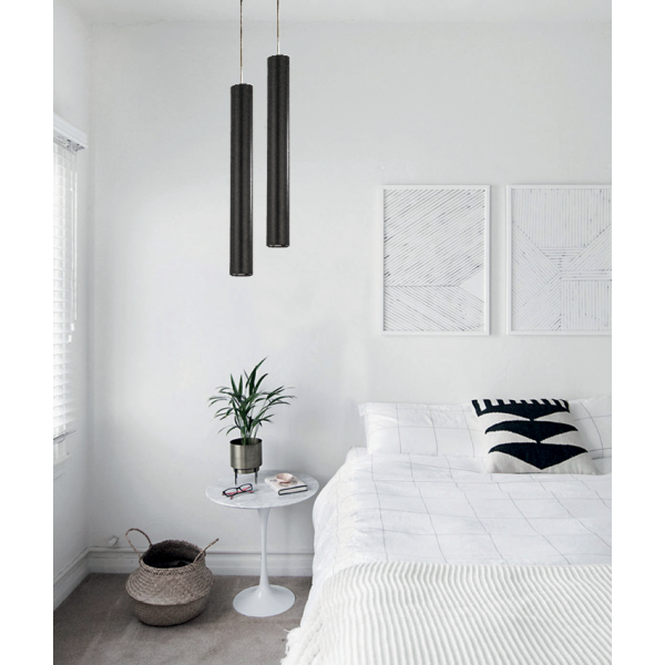 Πρόκειται για ένα μεταλλικό κρεμαστό φωτιστικό μαύρου χρώματος. Το ύψος της ανάρτησης μπορεί να ρυθμιστεί ώστε να προσαρμοστεί σε κάθε μοντέρνο εσωτερικό χώρο. Αυτό που κάνει ιδιαίτερο το φωτιστικό αυτό είναι ότι το ύψος του σωλήνα μπορεί να μεταβληθεί προκειμένου να καλύψει τις ανάγκες του κάθε χώρου. Μπορεί να τοποθετηθεί είτε μόνο του είτε δύο τρία ή και περισσότερα μαζί σε ροζέτα ή ράγα.