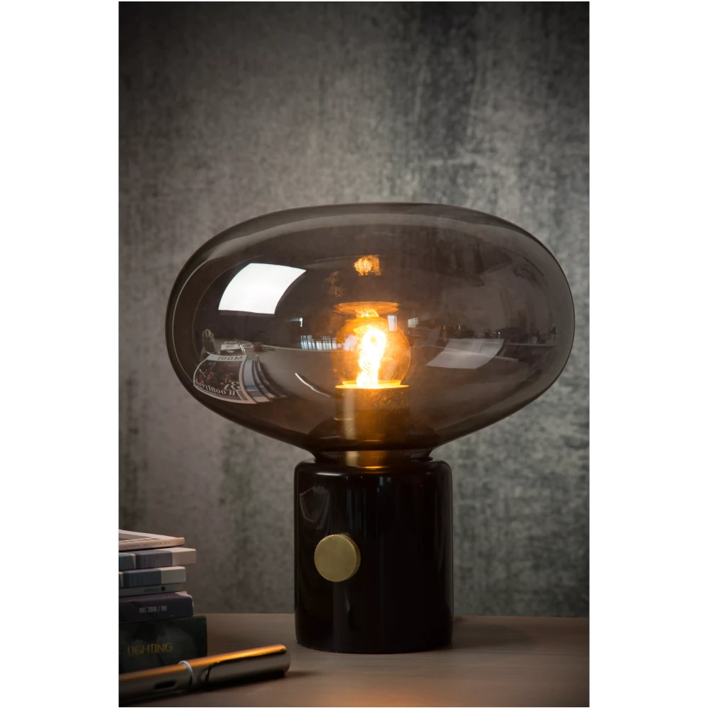 Charlize, an elegant and timeless name for this ditto table lamp. The combination of a high-quality marble base with amber or smoked glassware as a hood, makes Charlize a unique retro piece in every interior. With a suitable LED lamp she brings warmth and cosiness into the living room, dining room or bedroom. The round table lamp with a diameter of 23 centimeters can easily be switched on and off using a switch that is incorporated in the cord.