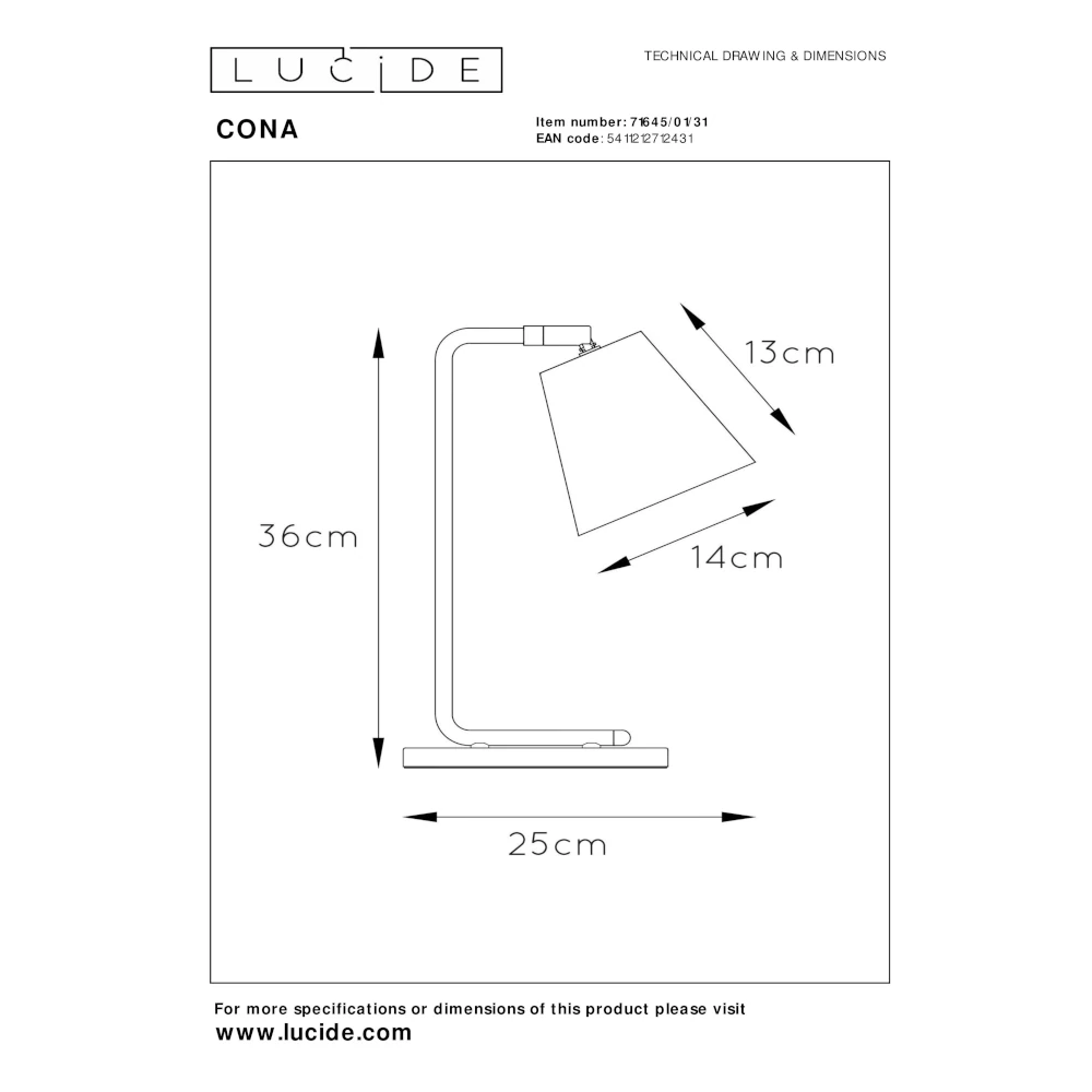 Durable, pure, functional and authentic. This is, in a nutshell, what modern Scandinavian design stands for. These qualities are united in the beautiful Cona table lamp from Lucide. Despite the fact that the Cona exudes simplicity, there are very nice details worked into this armature lamp. Take, for example, the wood motif steel rod that extends in a beautiful curve from the shade over the horizontal surface of the oval-shaped base. The fairly large white metal shade with a Ø 14 cm gives a pleasant light. In addition, the shade is fitted with a knee joint, making it easy to rotate and direct. The Cona is available as a table and floor lamp.