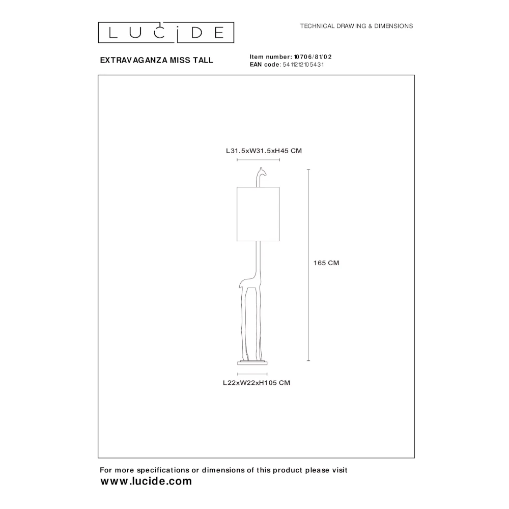 Miss Tall came by her name honestly. Not only is this floor lamp 160 centimetres high, the name is also a reference to the design. This stately giraffe is the newest member of the Extravaganza collection. It is made of high-quality plastic and has a cotton lampshade around the neck with the LED bulb in the middle. This floor lamp is a playful and original addition to your interior, with just a bit of a retro touch. Switching it on and off is done easily via the switch in the cord.