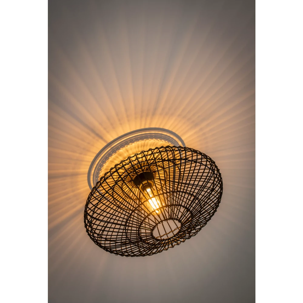 Say what? Say rattan! Meet Magali, a striking ceiling lamp in which the filament light bulb is surrounded by a braided network of rattan threads. The oval-shaped outer shell gives this ceiling lamp plenty of body to show off. With a height of 31 centimetres and a diameter of 56 centimetres, Magali is flexibly usable. Above a dresser or in the kitchen, hall or toilet? Check. If you connect the lamp to a dimmer, you always have exactly the light you are looking for, wherever you are.