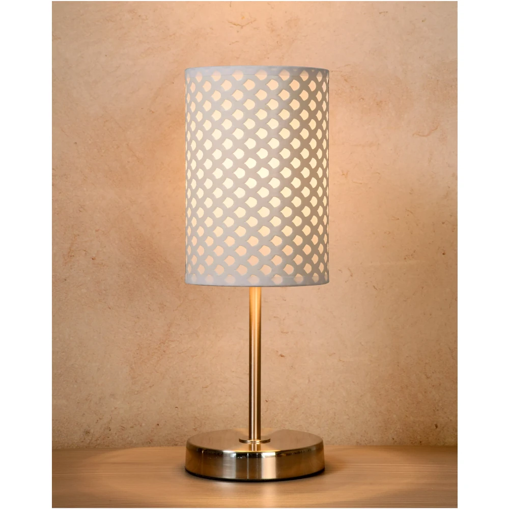 The silver-coloured Moda table lamp makes an immediate impression with its unusual, sleek design and sparkling appearance. The trendy and modern lamp, with its construction, is ideal for the living room or the dining room, where it provides a cosy and comfortable atmosphere in a snap. The stylish lamp is 37 centimetres high in total. The unusual shade with a unique motif is 30 centimetres high and has a diameter of 30 centimetres, both top and bottom. A sophisticated and refined lamp for the interior of your dreams.