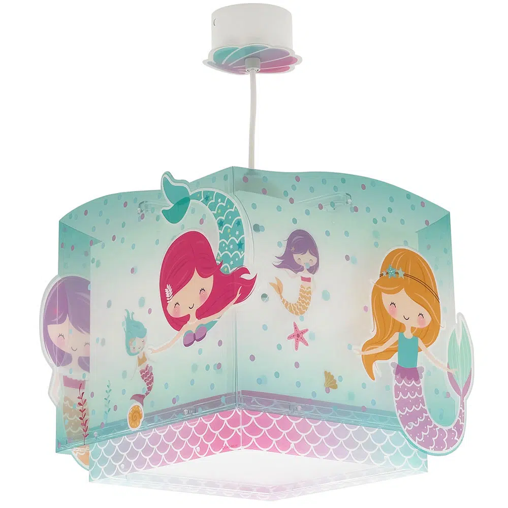 Παιδικό φωτιστικό οροφής με θέμα τις γοργόνες κατάλληλο για γενικό φωτισμό. Είναι διπλού τοιχώματος με διάφανο το εξωτερικό του τοίχωμα και φωσφορίζοντα μαγικά μέρη στο σκοτάδι. Κατασκευασμένο από συνθετικό υλικό αντοχής λεπτού πολυπροπυλενίου και ανεξίτηλες εκτυπώσεις. Παρέχεται διαχυτής φωτός για τις μικρότερες ηλικίες προσφέροντας ομοιόμορφο φωτισμό αλλά και προστασία στα μάτια. Το Mermaids κρεμαστό παιδικό φωτιστικό οροφής τοποθετείται εύκολα και είναι κατασκευασμένο εξ ολοκλήρου στην Ευρώπη.